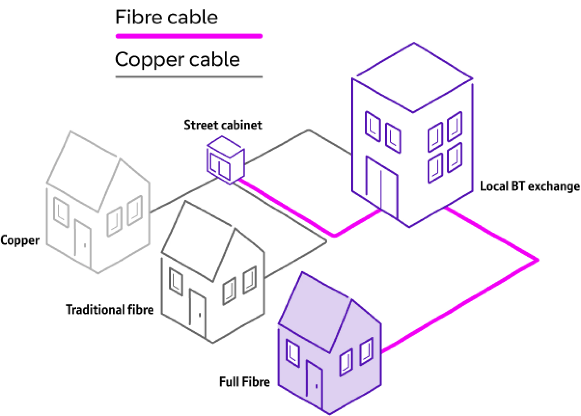 FTTC (Fibre to the Cabinet) uses fibre to the street cabinet but copper cables to the premises. FTTP uses fibre optic cables all the way to your building, providing faster speeds and improved reliability.